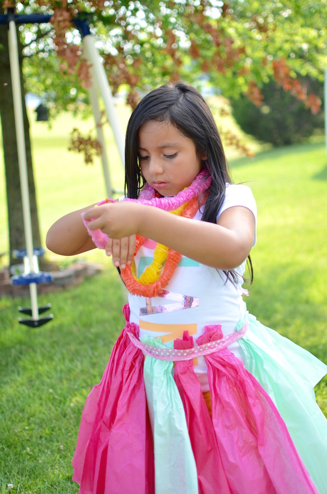Lista la falda, colocamos los collares de papel en nuestro cuello para complementar el outfit.