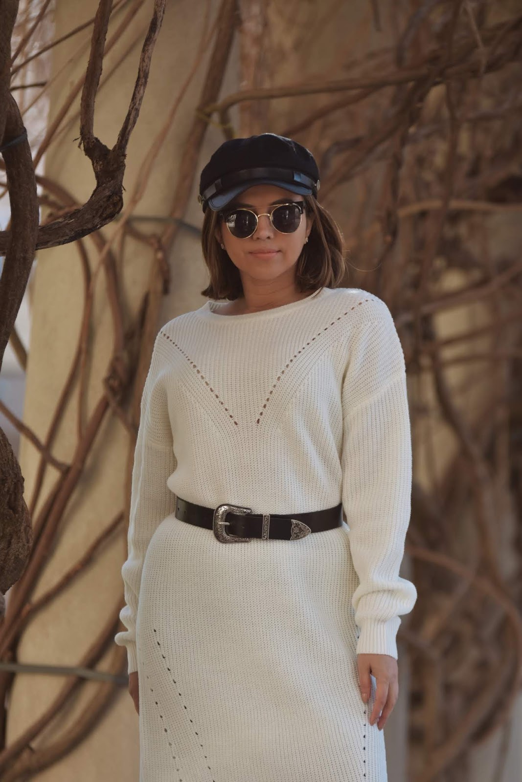 Usar un vestido suéter es una de la opciones perfectas para las mujeres que aman usar vestidos los 365 días del año. Hoy estoy combinando un vestido suéter largo, de hombros caídos en color blanco. Y los complementos los estoy llevando en color negro, ustedes saben que son colores que nunca fallan.